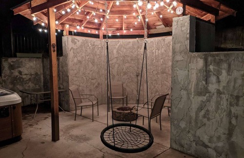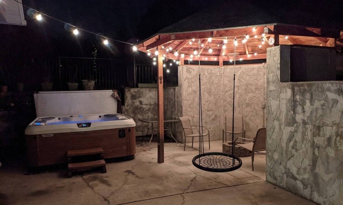 The hot tub is located on the backyard patio near a gazebo with beautiful lighting and a propane fire pit.