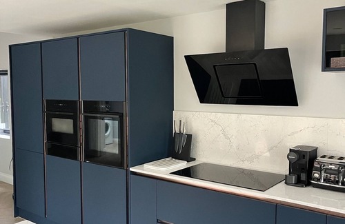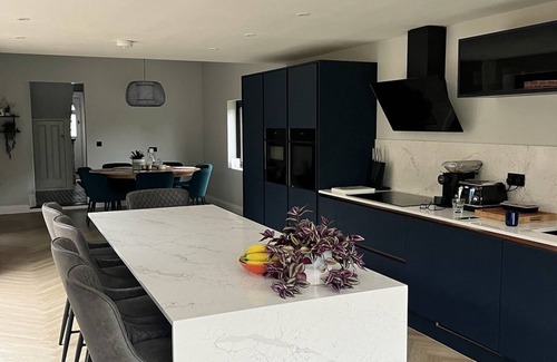 The recently renovated kitchen / dining space has a large dining table which seats 8, together with a sit up island to seat 5, perfect for big gatherings. Our home has a wood burner in the lounge ensuring the house is toasty and welcoming all year round ! Our large and modern kitchen with island has all the mod cons youcould wish for ! The beautiful south-east facing wrap-around garden has a bbq , a decked outdoor entertaining area with lounge seating for 10 and a dining table which seats 8. There is also a trampoline to keep the children happy ! We recently installed a hot tub and pizza oven which are for guest use.