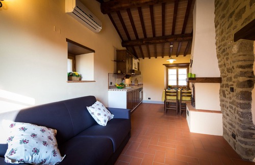 The raised position of the house offers a wonderful view of the entire Val di Chiana, however especially from the swimming pool, situated in panoramic position on a natural terrace, the gaze wanders up to Montepulciano, the shape of the Monte Amiata and to the shores of the Trasimeno Lake: a landscape that colours in red at sunset in the pleasant summer nights. In order to enjoy their relaxing moments and to eat in the open air, guests have on their disposal two nice gazebos in wrought iron, one located in front of the house and the other one made next to the pool. The old wood-burning oven can be used also as a BBQ. The adjacent annex is for owners' exclusive disposal, who may occasionally live there for short periods, leaving in any case the swimming pool at guests' exclusive disposal. The farmhouse is situated few km away from the magnificent Etruscan town of Cortona: strategic position in order to be able to visit the picturesque art villages and towns in Tuscany and Umbria and is particularly suitable for those who love mountain biking and trekking.