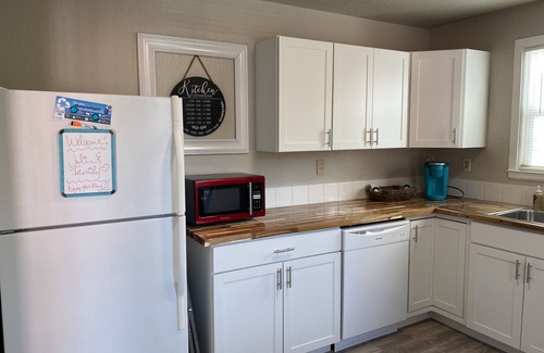 The kitchen includes a refrigerator, stove, microwave, Keurig coffeemaker, blender, toaster, cookware, pots and pans, wine glasses, and a wine opener. There are plenty of dishes and silverware for a nice dinner or a family breakfast. You will also find coffee, creamer, sugar, green tea, hot chocolate, oil, salt, and pepper.