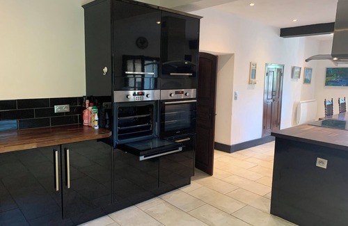 A dining room and large, well-equipped kitchen including: electric kettle, 2 ovens, toaster, dishwasher, hotplates
