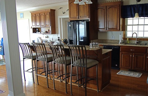 The full kitchen is equipped with a gas range, a large-capacity microwave, and a full-sized refrigerator and freezer. Other useful appliances include a toaster, a kettle, as well as a single-cup coffee maker that takes grounds or k-cups. The kitchen is outfitted with almost anything you need to make a family meal- dinnerware, pots/pans, colander, mixings bowls, and baking sheets as well. An island for additional prep completes the kitchen and offers a wonderful place to enjoy a cup of coffee or a workspace to inspect the day’s beach finds. A gas grill sits just outside on the deck, ready to prepare the day’s catch or the fresh steak and seafood you picked up from the nearby seafood market in Mathews.