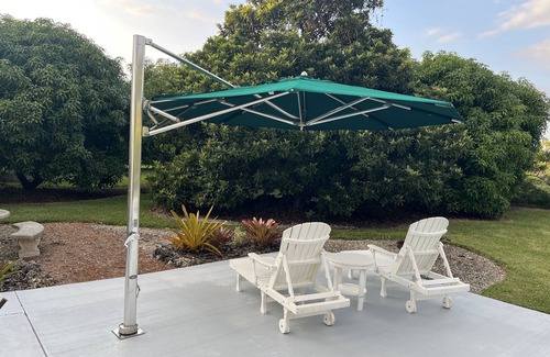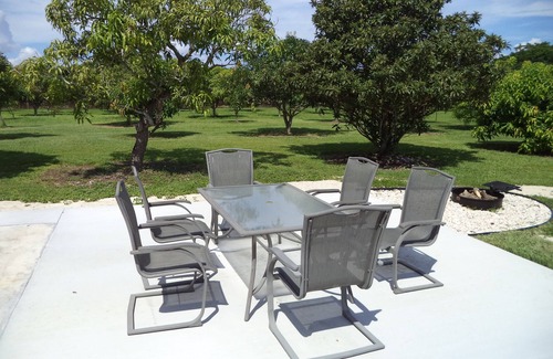 (Taking reservations for Dec, Jan. and April) This Redland 1,200 sq. ft. concrete block guest house sits on 5 acres of tropical fruit trees including avocado, mango, ciruela, carambola, guanabana, lychee, jackfruit, allspice and others. It is located in a very desirable area of the Redland, just a few miles north of downtown Homestead and just 20 minutes from Everglades National Park or Biscayne National Park and two marinas where you can launch your boat. Key Largo is 40 min. south. The Redland Fruit and Spice Park is 1/4 mile away. The house is totally furnished with the highest quality of materials including: pillow-top mattresses, down pillows, down comforters, solid wood furniture and beds, mahogany nightstands and dresser, granite top nightstands and dresser, designer mirrors, granite kitchen full stocked, brand new solid wood kitchen cabinets, all-stainless dishwasher, garbage disposal, wine cooler, washer/dryer, 5 new ceiling fans, eleven chairs with leather seats, large pantry, Italian leather (Natuzzi) sofa and love seat, the highest-quality on the market plantation Polywood shutters throughout the home, hurricane accordion shutters on all exterior windows, large closets, several lamps with electrical outlets in their bases for easily charging devices and much more. There is a master bedroom (sleeps 2) with a king bed and another bedroom (sleeps 4) with a full-size bed and two twin beds. There are LED 1080p high-definition 32" SMART TVs in both bedrooms, as well as a 50" LED 4K SMART TV in the living room, all TVs have free NETFLIX and free Amazon Prime movies and different movies can be streamed, simultaneously on all three TVs. A 7th person could sleep on the sofa or could request the use of an air mattress. Extra bedding would be provided. The master bathroom has a tub/shower. The hall bathroom has a shower. Both showers have frameless glass sliding doors. There are two ADA grab bars in each showering unit. Both bathrooms have quartz countertops and solid wood cabinets. There are stainless ADA hand railings to both sets of steps. There is an electronic gated entry and new concrete driveway leading to both the front door and back door of this guest house. The back patio area is very large and will accommodate multiple vehicles, a boat, an RV, a box truck, etc... Water is provided via separate well to the guest house and is run through a water softener. A water cooler and 5 gallons of drinking water provided (this water is not softened and is filtered/purified). There is a $50 cleaning fee and required taxes will be charged according to State of Florida and Miami-Dade County law. The home has a 3 ton central air-conditioning. Tropical fruit from the property is provided for guests when in season, depending on the fruit. Most fruits are in season from May through September, tapering off after September although some are still available nearly year-round ( carambola and avocados). There is high-speed cable internet, which is hard-wired directly to the house. This then connects to a router so there is uninterrupted and very fast Wi-Fi (100+Mbps) throughout the home. You just need to type the password into your device, which is located on the router and provided in the arrival instructions. A second set of linens and towels are provided upon request for stays of more than 5 nights . There is no maid service. There is a large sink with hot/cold water on the patio out back with a separate set of hot/cold valves for washing and rinsing dive gear, snorkel gear, vehicles, boats, fishing equipment, etc. You may also clean your fish. A campfire pit with cooking grate is available and firewood may also be available, depending on the time of year. Absolutely no pets and not negotiable. We want to be able to cater to guests with allergies to pets. PLEASE DO NOT CONTACT US ASKING TO RENT THE PROPERTY TO HOLD LARGE GATHERINGS, WEDDINGS, RECEPTIONS, CEREMONIES, PARTIES, ETC... THAT INCLUDE MORE THAN 7 PEOPLE ON THE PROPERTY. This is a vacation rental home in a very serene, quiet and peaceful property and we wish to keep it that way for our guests who come (most from far away) to enjoy their time 'away from it all'. We believe that the house is complete and has everything you could possible want or need. If it doesn't, we'll do our best to get it for you during your stay. This place truly is spectacular and we are confident that you will be glad that you chose to stay here.