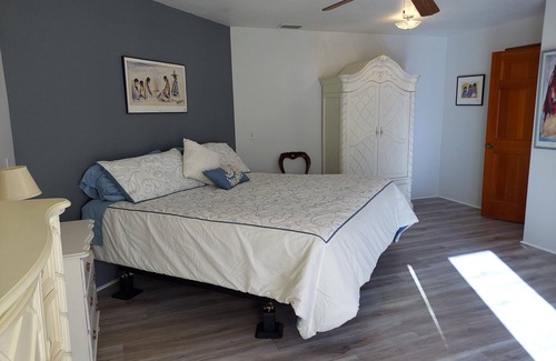 Lovely 2000 square foot home with 2 bedrooms and two baths. The very large master bedroom has option to use total blackout elecric shutter. A third bath is accessed from the outside. (Pool bath with shower)