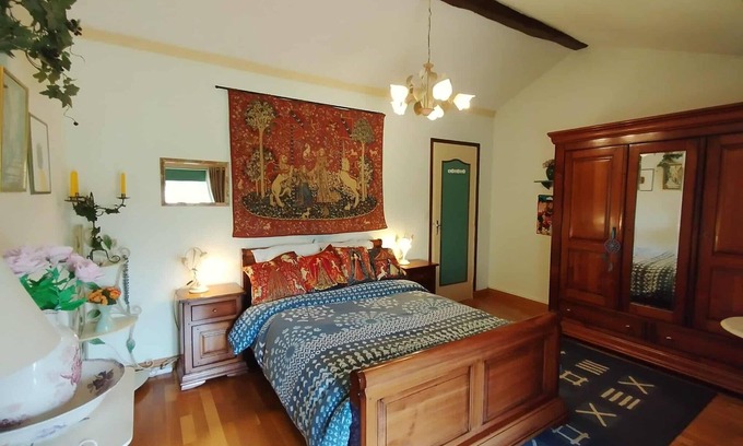 Beautiful guest room in an old farmhouse full of character. In the heart of nature, in a peaceful setting. A stream and a pond on the property, which is well planted with trees. An island of biodiversity. Lovely walks on the property and in the surrounding area. A tourist region with a medieval heritage of great interest. The Atlantic Ocean is 1? hours away. Cosy accommodation for two people, with the possibility of adding a child's bed. Inflatable Jacuzzi available on request (€10 for 2 people). Breakfast available on site - €6/person