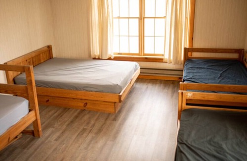 Each bedroom has 1 full size bed and 4 twin size beds as well as a full bathroom attached to each one. With a total of 8 bedrooms the recommended max sleeping capacity is 48 people (Pets allowed under 35 pounds). The Hartman Lodge also comes with a very large 39'x22' common area and a 25'x17 covered porch looking into the wood line for privacy. It also has a full kitchen and dining area.