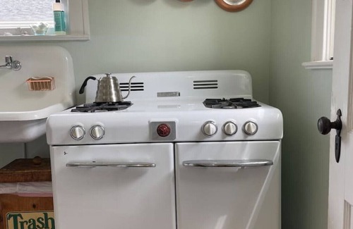 The kitchen is fully equipped with ample cookware, dishes and cutlery. It is stocked with glassware and barware, and even melamine dishes for outdoor use. There is an antique farmers sink and gas stove, as well as a dishwasher, side by side refrigerator, microwave, coffee pot and grinder, air fryer, and toaster. We also provide a complimentary coffee and tea set up for your enjoyment during your stay.