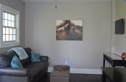 MODERN ELEGANCE AWAITS YOU AT THIS 1 BEDROOM SUITE. Located in the heart of Saugerties just minutes outside of the Village. Peace, Mountain views, rolling lawn, and 25 acres of Hiking trails are all part of this Home's experience. Saugerties, named one of the top ten coolest towns in the country. Wonderful restaurants and a most charming Village to explore. One Bedroom Suite accommodates 2-4 comfortably. Carriage house apt. attached to main house, but completely private. Equipped with (2) Flat screen TV's, electric fireplace, refrigerator, kitchen sink with faucet, microwave, toaster/convection oven, Keurig coffee/tea maker. Pull out leather sofa with memory foam queen size mattress and another queen in the Bedroom.
