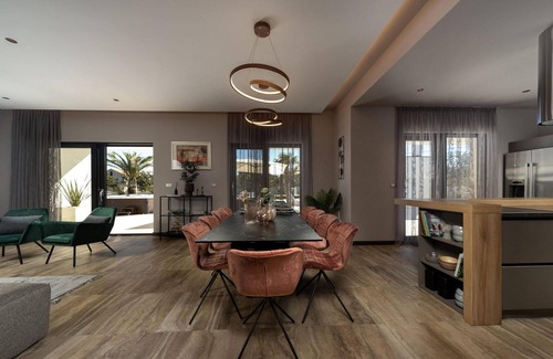 Villa Quercus welcomes you into a modern and stylish ambience characterised by clean lines and high-quality materials. The open-plan living and dining area with large glass fronts combines elegance and cosiness and invites you to spend time together chatting or enjoying a games evening. Prepare tasty meals in the modern, well-equipped kitchen and delight your family or friends. In the activity area, billiards, table football and our own wine bar offer plenty of opportunities for sociable evenings.