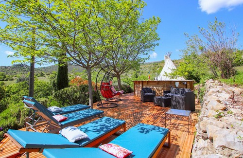 Relax in privacy, take a dip in the beautiful wooden pool, which is shielded from view, and spend quality time on the various sun terraces while admiring the sweeping views of the Dentelles de Montmirail and the majestic Mont Ventoux. Young and old alike can dream up different scenarios around the real Indian tipi and turn back time by camping under the starry skies of the south of France.