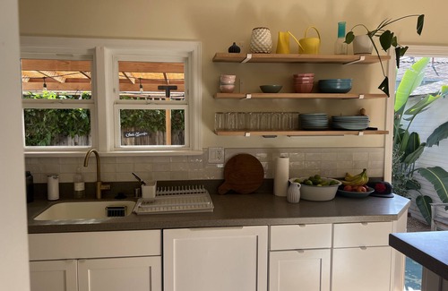 Relax in this calm, stylish house built in 1928 decorated in a colorful chic style. This serene home inspires happiness and focus. Great for an executive coming into Los Angeles to work on a project, a small family starting afresh, a couple excited to explore and enjoy the sights.