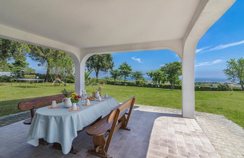 This beautiful independent vacation home with large panoramic garden and sea view is located only 2.5 km from the beaches and 11 km from Fano, a popular summer destination on the Adriatic Sea. The house is situated on a hill overlooking the coast and offers sea views from the entire garden, the veranda and the fully glazed gym where you can work out and enjoy the picturesque view. The fully fenced garden with access through an electric gate has a large veranda with kitchen, barbecue and fireplace for outdoor meals. Nearby, a beach volleyball court and various activity and relaxation corners are available. The house consists of three independent apartments and is ideal for families and groups of friends who want to spend their vacations together without giving up their own privacy. The apartment on the second floor is accessible via a spiral staircase. In the garden level apartment, the large living area with kitchen and fireplace is perfect for moments of togetherness when it is too cool to dine in the garden under the veranda. Covered parking on the property for 3 cars. Location: the Roman town of Fano 7 km, the port of Pesaro 18 km, Gradara Castle 35 km, fashionable Riccione 60 km, the Republic of San Marino (the oldest in the world) 73 km.