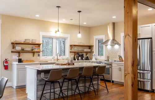 Woodland Retreat is a brand-new home with all of the modern touches you love and all of the character you crave. This home is warm and inviting–perfect for a quick getaway or extended family trip, work retreat or wellness refuge. The home features a gorgeous and expansive kitchen, perfect for entertaining and making memories with family and friends. It includes a center island with breakfast bar seating; ample countertops for prepping, all-new stainless steel appliances including a dishwasher for easy clean up.