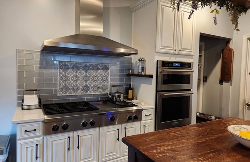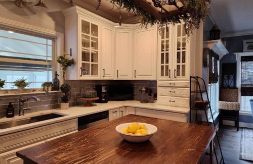Modern amenities, kids room that is equipped with 5 twin beds, toys, and a TV for movie night, private outdoor oasis with a grill, electric fire place, and a great pool with a view! Close to your stunning escape, you'll appreciate easy access to a variety of parks, museums, restaurants, golf clubs, and shops. Back at your stay, the fun only continues as you head outside and sit poolside in the home's backyard. There is a large side and front yard perfect for corn hole and other lawn games! Find yourself admittedly charmed as you pull up to the driveway of this expansive North Carolina home. This home offers a large covered front porch with comfortable outdoor furniture and swing, you can't help but feel immediately welcomed. And the view is one for the books! Inside, you'll find a comfortable main living room adorned with plush seating, carefully curated decor pieces, and a large TV. The adjacent kitchen gleams with its marble countertops, stainless steel appliances, and a vintage wood island. Test your culinary skills and whip up a delicious meal to serve at the lovely dining table.