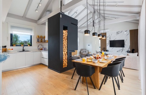 The stylish living area impresses with its tasteful furnishings and large windows that flood the room with natural light. In the evening, the impressive designer fireplace and sophisticated lighting create an extremely cosy ambience. Cosy sofas and a harmonious colour scheme guarantee that you will feel completely at ease from the very first day of your holiday.