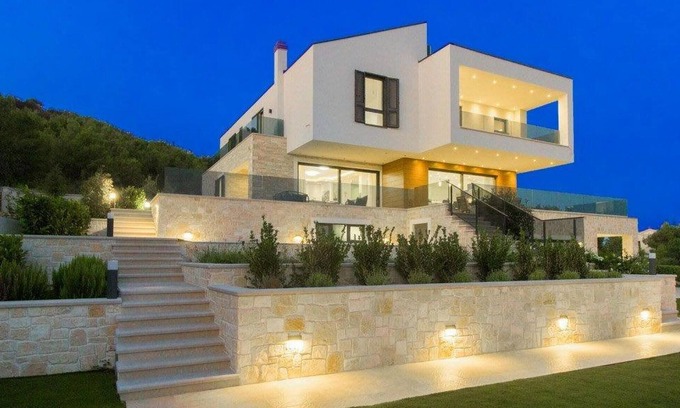 The luxury villa Marko is located near the town of Sibenik, in the quiet village of Tribunj, which is known as a tourist centre with a beautiful landscape consisting of numerous islands such as Logorun, Lukovnik, Prisnjak and Sovljak, which lie in the sea in front of Tribunj. The speciality of Tribunj are its narrow streets and densely built houses, only 4 km away from Vodice. In Villa Marko you will find a peaceful and happy place for a perfect holiday, whether you come with a group of dear friends or with children. Villa Marko is built in contemporary style on 3 floors, has 350 m2 of living space and offers accommodation for a maximum of 8 guests. It is 550 metres from the bright and clean sea and just as far from the nearest beach. The villa is fully air-conditioned and has 4 bedrooms with 4 double beds, and all rooms have their own bathroom with shower. As additional content, the villa has a separate toilet, and you can use a washing machine and an iron. Near the living room there is a dining room with a dining table for 8 people. The modern kitchen has everything you need to prepare delicious meals for your family. On the outdoor terrace you will find a beautiful heated pool with an area of up to 93 m² and a depth of 1.2 m and 1.5 m, where you can really relax and refresh yourself on hot summer days. Other features of the pool include a waterfall and counter-current swimming, and you can also sunbathe on 8 sun loungers. For additional enjoyment on the terrace, there is a seating area where you can drink coffee and read your favourite books. Preparing delicious meals will never be easier as you can use an outdoor gas barbecue. The villa is fully fenced and offers sea views from almost all rooms, which gives it uniqueness and specialness and allows you to relax and enjoy the unspoilt nature. Among the entertaining contents that round off your stay at Villa Marko are table football, table tennis and darts. If you are a fan of active holidays, you have the option of using a stationary bike and running on a treadmill. The hot tub and sauna are also part of this beautiful villa, where peace and quiet are guaranteed and you can enjoy the tranquillity they offer with all your senses. Inside the courtyard there are 4 private parking spaces, while outside the courtyard there are two more. Villa Marko has cameras all around the exterior to protect the owner and guests. This villa is intimate and secluded in nature surrounded by dense pine forest with no neighbours.