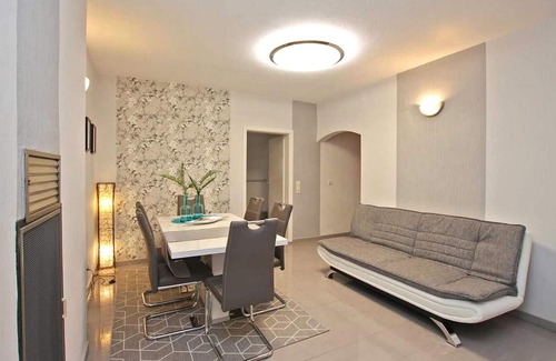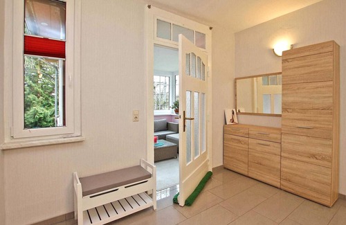 Quiet yet centrally located at the foot of the Mühlenberg, this holiday home for up to 6 adults and 1 baby, which was extensively renovated in 2021, is located on a separate plot of approx. 400 sqm. Two supermarkets and a café are in the immediate vicinity, the city centre is only 500 m away. 80 square metre, centrally heated (underfloor heating in living room, kitchen, bathroom) non-smoking house has a large veranda surrounded by roses, a living room (sofa bed, armchair bed, dining table, flat screen TV), two bedrooms (each with 2 single beds, TV, tiled stove can be heated on request), an open kitchen (electric cooker with oven, fridge-freezer, dishwasher, microwave, various small kitchen appliances, small dining table), a bathroom with shower and toilet. In addition, there is a cot, high chair, various seating options in the garden, barbecue and fire bowl, two parking spaces, bicycle storage facilities, free Wi-Fi, physiotherapy treatments and massages (for a fee).the total price includes final cleaning, water, electricity, bed linen and towels. To be paid on site: if desired - massages according to price list (prescriptions can also be redeemed). One dog is allowed in this property, several or other animals require the consent of the owner before booking.
