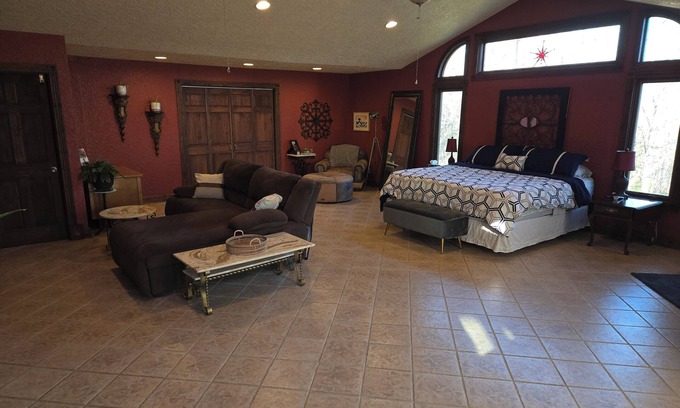 This Cobden country chateau boasts 3 inviting bedrooms with 3 king beds, 1 queen bed, and 2 twin beds, a cooks kitchen, sun room, and so much more makes it perfect for relaxing after a day of exploring all the charms of Southern Illinois, guests will feel right at home. Nestled in the Shawnee just miles from Giant City State Park and 5 wineries. Whether you're floating in the pool, relaxing in the sun room or getting lost in the sky on the stargazer bed this property is the perfect retreat for a memorable getaway. It's easy to see why you'll be able to unwind at our not so far away getaway.