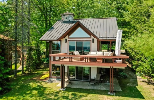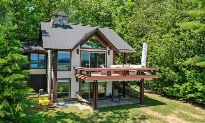 West Higgins Waterside Retreat offers enviable access to crystal-clear waters. With 75-feet of private Higgins Lake frontage, you can wake up to breathtaking sunrises while sipping on your morning coffee on the deck. Large windows provide panoramic views of the lake, ensuring you're always connected to the breathtaking natural surroundings.