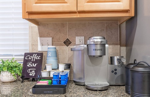 The heart of the home is our fully equipped kitchen, featuring a Keurig coffee maker, toaster, blender, air fryer, microwave, stove, refrigerator, pots & pans, dishes, and silverware. Essential cooking ingredients such as salt, pepper, spices, and sugar are provided, along with complimentary coffee and tea.