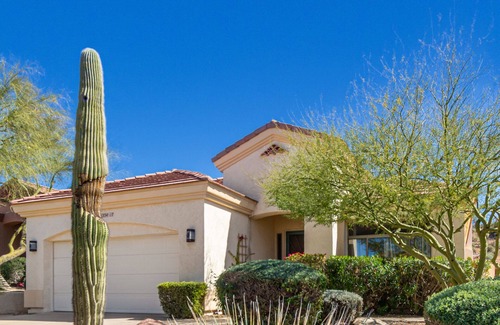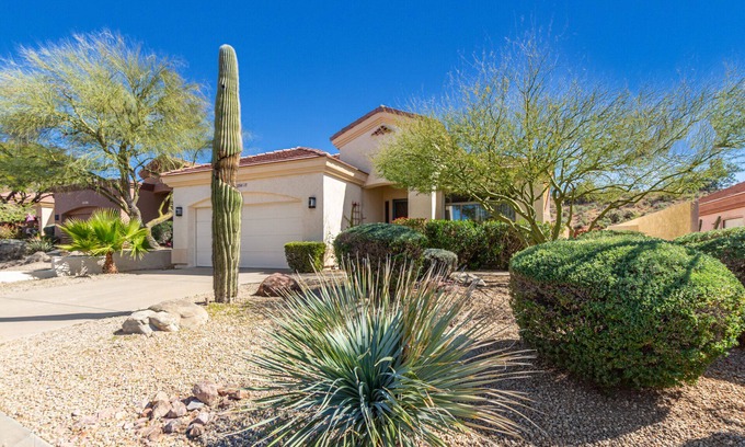 The comfortable, secluded patio backs up to a desert hill for ultimate privacy complete with a BBQ grill, outdoor tabletop fire pit, professional landscaping, and a private pebble-tec heated pool. This home features a contemporary floor plan with a gas fireplace, large-screen HD TVs, and a stereo system in the great room along with outdoor patio speakers. There is a second large living room with a large dining table and big-screen TV. The vaulted ceilings and huge windows let the AZ sunlight shine all around, including the spacious master bedroom. New hardwood flooring in bedrooms and halls, along with many new furnishings including a leather couch, oversized chair, and more. Two-car garage with cabinets. TVs in all bedrooms, great room, and living room, with free high-speed Wi-Fi.