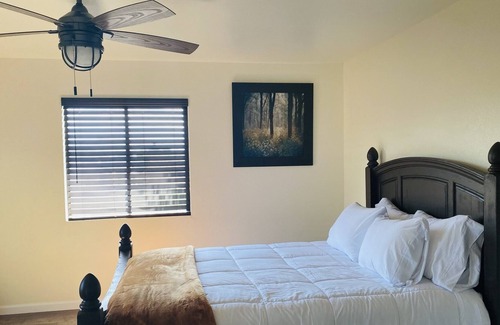 This home resides amongst orange blossoms and festive bird chirping during the morning hours. Sit and have a cup of coffee on the deck or take a stroll through the calm orchards. After an adventure in one of our National Parks, head downtown for an elegant dinner, local breweries, or cook in the comfort of this well-equipped kitchen. End your day with the comfort of a good glass of wine or cocoa next to the outside fire pit.