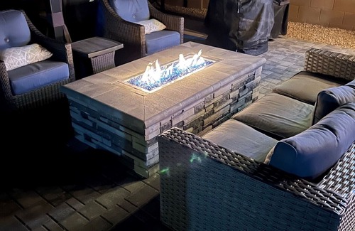 Beautiful, newer, 5 bedroom, 3.5 bath, 6 beds, sleeps 10. Private pool with waterfall and grotto, huge backyard with hot tub, lounge chairs, gazebo, firepit, outdoor wet bar, ping pong, cornhole, giant Connect4 and an additional under cover fire table. Basketball court is a quick 4-5 minute walk. Quiet neighborhood, close to grocery/food. Smart TVs in all bedrooms. Pool cannot be heated in December or January. We DO have security cameras in the driveway, front door and back yard for safety purposes. We do NOT monitor guests, and have no intentions of viewing them during your stay, only in the event of an issue.