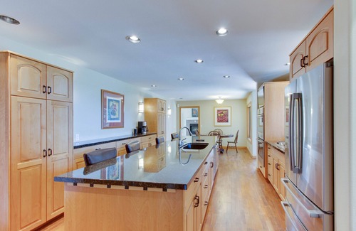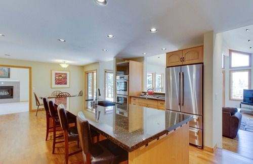 Enjoy expansive views from the decks surrounding the entire home. The property is frequently visited by elk, moose, and deer. Relax by the stream and pond with its constant bird activity. Get out and explore with the two bikes provided. Or stay in and enjoy a barbecue dinner made on the gas grill. Anyone will feel like a chef in this gourmet kitchen featuring high-end Bosch appliances. After dinner, warm up by one of the three gas fireplaces or play a game of billiards on the pro slate pool table. Curl up in front of the 75 inch 4K TV in the dedicated media room which features a full cable package, Netflix, Amazon Prime Video, HBO, Showtime, and other media apps. Free high-speed WiFi is throughout the house and decks in addition to the Blu Ray player and Sonos stereo so you can stream your own music off your phone into the great room.
