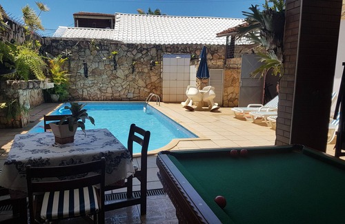 Comfortable house in the center of Rio das Ostras, with 5 bedrooms (3 suites), comfortable living room, large kitchen, balcony with hammocks and rocking chair and backyard with barbecue, swimming pool, pool tables, foosball and ping pong. Fantastic location for those who want to enjoy the beach, which is 3 minutes walk from the house. You don't need a car for anything (bakeries, markets, pharmacies, nightlife, craft fair and general trade)