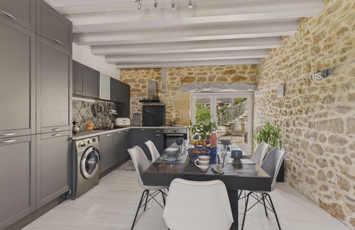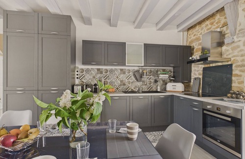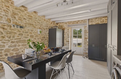 The kitchen, modern and warm with its exposed stone wall, is fully equipped: refrigerator, freezer, dishwasher, oven, Nespresso coffee machine, kettle... The dining table invites you to savor your preparations in a friendly atmosphere.