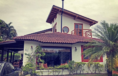 Welcome to our home. House on 2 floors, with two suites with AC, one with balcony with views of the hill, a 3rd bedroom for children, and a 3rd full bathroom. In addition to living room with American kitchen very spacious, dining room, service area, gallery with barbecue, parking, and a charming garden right in front of the hill. Quiet condominium with security cameras and electronic gate. Very good location, near supermarket, pharmacy, restaurants, 150 mt from the beach!