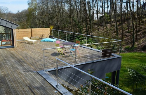 Quiet, beautiful detached house with a magnificent 110 m² wooden terrace facing south and a lovely view of a wooded area (150 m² living space + 800 m² of land).