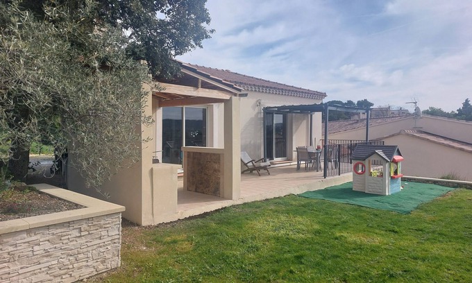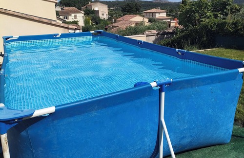 The house has stunning views of the surrounding valley, providing a peaceful and inspiring setting. Outdoor facilities include a 4 meter by 2 meter tube pool, 80 cm deep, a children's playhouse as well as a trampoline and a summer kitchen equipped with a vertical barbecue, ideal for enjoying the magnificent sunsets on the surrounding mountains.