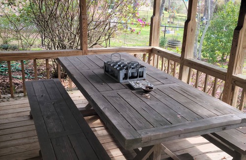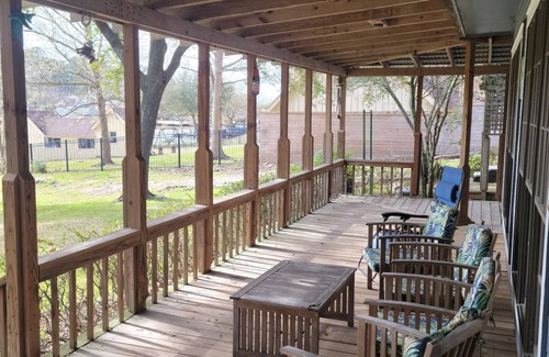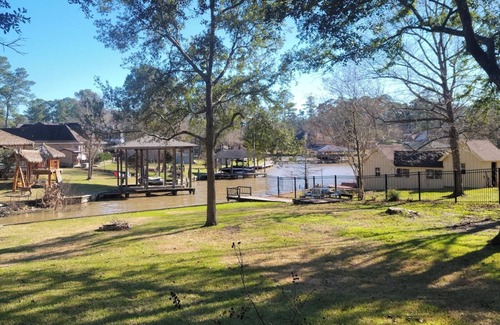 Bring the whole family & friends to this 2500 sq/ft wonderful retreat with lots of room for fun, & relaxation. A half acre lot on the water. 45 minutes from downtown Houston! Gigantic wrap around porch. All 3 bedrooms have king-size beds and it's own big screen TV. The upstairs kids loft has 2 queen beds. Bring your boat, and tie up to the bulkhead!