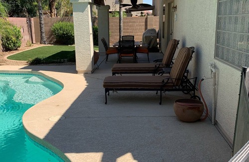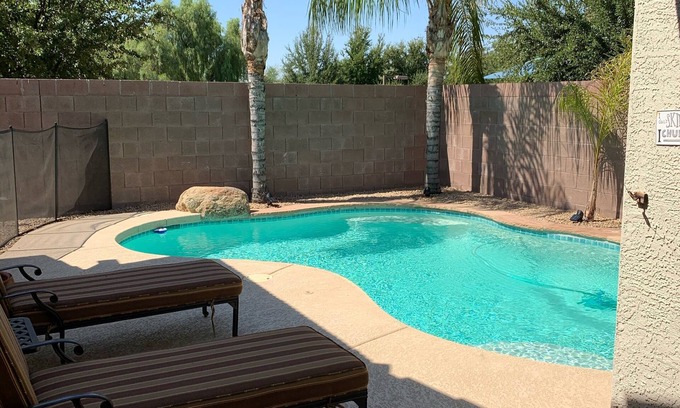 3 bedroom 2 bath house sleeps 5 master bedroom has king bed while other bedrooms have a queen and twin. comfy beds & furniture; multiple outdoor living spaces, propane grill, beautiful heated pool, office, fully equipped kitchen,cable tv, wireless internet , close to spring training site, in a cul-de-sac near park green space. Provided: towels, linens, washer, dryer, double garage.