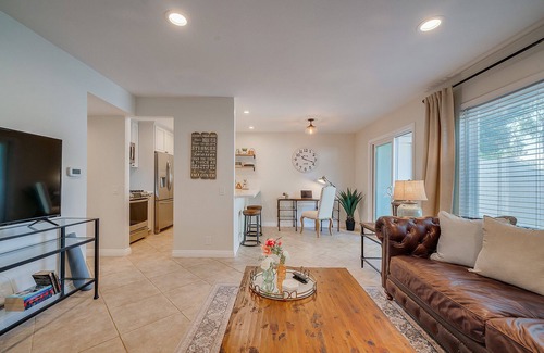 The immaculate kitchen is equipped with top of the line appliances along with a wine fridge and is stocked with everything you’ll need to cook a feast. The living room has comfortable seating to curl up with a good book and a large flat screen TV. Enjoy high speed WiFi(up to 250 mbps) at your own workspace. The bedroom features a luxury pillow top mattress with plush bedding and the closet has plenty of space to unpack your bags. Plus, your bathroom is stocked with the essentials, including shampoo, conditioner, and body wash. Enjoy your favorite cocktail by the fire in your well-furnished back yard.