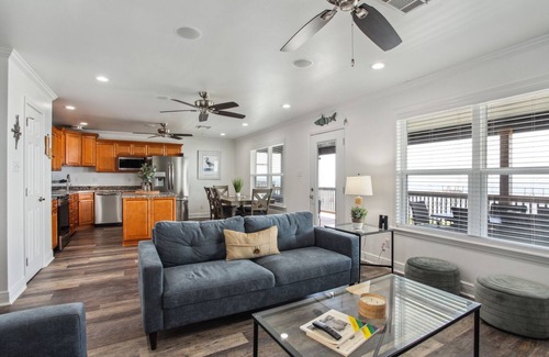 Inside the home we have a large, modern kitchen with upgraded stainless-steel appliances, a prep island, and dining table for 6 – a perfect space for fish fries and crab boils! Open sightlines from the kitchen to the family living area are an entertainer’s dream, and the outdoor covered patio right off this space was made for lazy days enjoying nothing but free time on the lake. Plan on grilling the catch of the day out here on the propane grill then dining alfresco at our outdoor table with gorgeous lake views as your backdrop.