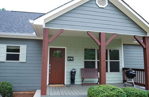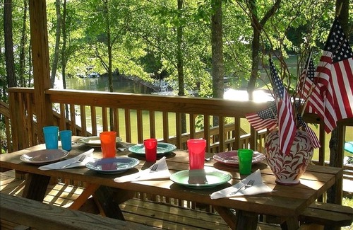 Enjoy the double hammock near the water's edge and porch swing on the dock for relaxing by the lake. Our cove is the perfect spot for kids to swim in the lake, right off the dock. We also have 'Kingsford' charcoal grill on the front porch... as well as beautiful outdoor furniture on the screened porch. The large screened porch is everyone's favorite gathering place, but there are more decks and porches to enjoy, including a dining gazebo by the water with a picnic table. Our 'Old Town' 3-person canoe is also available for our guests use.