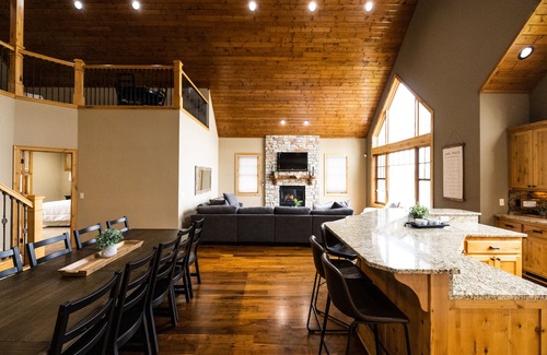 ✔ Main Level: Features an inviting open-concept living and dining area with breathtaking lake views, a cozy fireplace, and a spacious dining table for the whole family. The gourmet kitchen opens to a stunning sunroom—perfect for playing games, working on puzzles, or curling up with a book by the fire. The master suite offers a king bed, private bath, and easy access to common areas. Plus, a full bath and laundry room make post-lake clean-up a breeze.