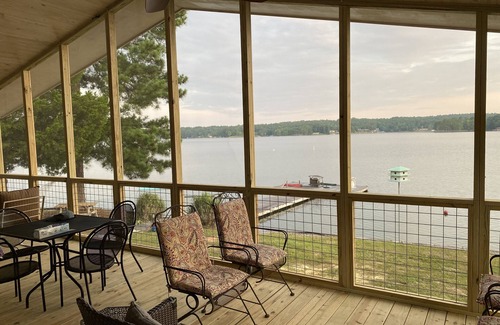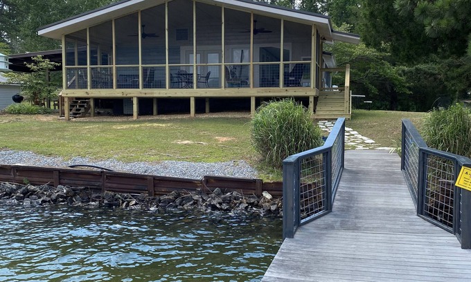 Recently renovated with full new bath/shower in bathroom #1 & new shower in bathroom #2 + a very private outdoor shower in the shade. This vintage cottage has been updated with new paint, fixtures, beds, bedding (along with blackout curtains for a good nights sleep!) , lovely screeened in porch with 180 degree view of the water, outside deck, boat slip, swimming dock, boat launch less than 1 mile down the road, play golf at Lake Winds Golf Course within 5 miles, close to Wind Creek State Park, Chimney Rock, The Ridge, rent a boat at River North Marina, beautiful sunsets, fun-filled days with water activities and lots of room for playing on land as well as parking space. The best view on the lake - water everywhere!!!! Lot is flat with easy access to house and water. Enjoy grilling out and relaxing -- beautiful open waters, fishing, boating, swimming, skiing, wakeboarding - fun family place. Short 30 minute drive to Auburn for football games one way; Spring House Restaurant, Catherine's Market, and Kowaliga the other way. Or just stay where you are and enjoy the sunset, watch the game on TV, grill out some steaks/fish/chicken and relax in the beautiful waters of Lake Martin.