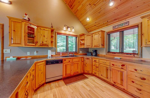 Escape to the serene beauty of Northern Wisconsin with a stay at this charming lakefront cabin in Presque Isle. Spread across three levels, this spacious house offers multiple living areas and a large yard, providing ample space for the whole family to relax and unwind. Step outside to your private dock and spend sunny days swimming in the crystal-clear waters of Van Vliet Lake, or gather around the firepit in the evening for s'mores and storytelling under the starlit sky.