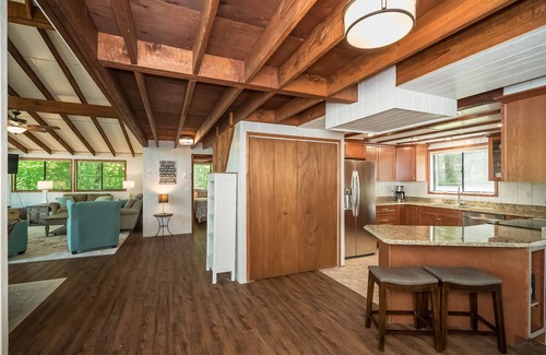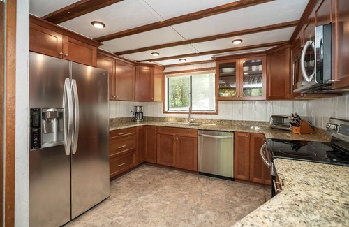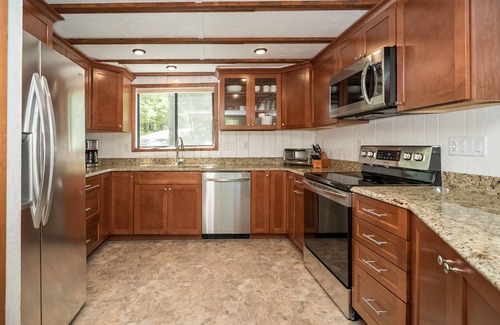 The newly expanded, updated kitchen is well-appointed with custom cabinets, granite countertops and new stainless steel appliances. You will love the large, open floor plan with vaulted ceiling living/dining area, stone fireplace, breezy four season room and two full baths. The newly expanded second bath has a shower and tub. The spacious deck overlooking the lake has a gas grill and plenty of seating for your relaxing barbecue. Satellite TV, Wi-Fi, games. Full-size washer and dryer for your convenience.