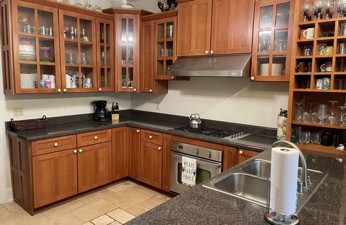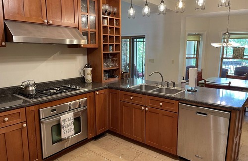 The main floor of the house has a large open room with high ceilings. The kitchen with granite countertops and stainless steel appliances is fully equipped for your stay. Everything you need to whip up a great meal is there. Large gas grill is just outside on the porch.