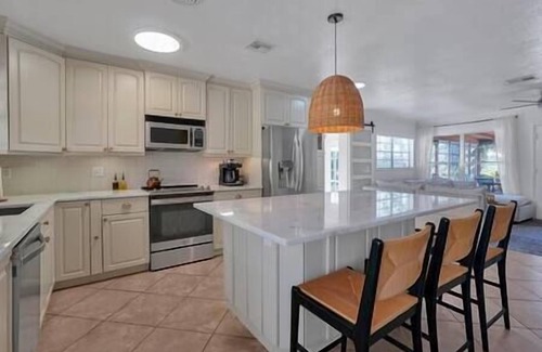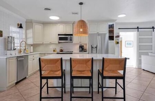 This is Florida and it does get hot!! We provide some sunscreen for you to use, and keep in mind the new refrigerator offers filtered water (and craft ice balls for cocktails!) The house itself is ready for you to escape the heat, and enjoy an open living room/kitchen area perfect for relaxing. The large 4K Smart TV on a black wall creates a movie-theater atmosphere in the evenings. Three bedrooms with closets, and two and a half bathrooms offer plenty of places for comfortable living. The laundry room was recently remodeled and we have a brand new washer/dryer for you to use as well!