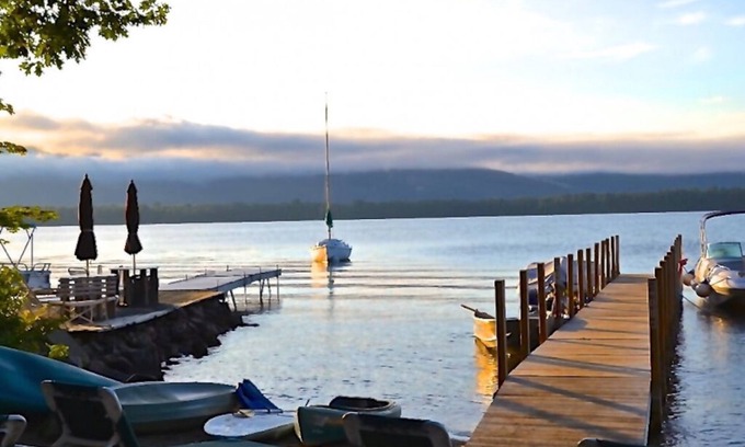 Beautiful Lakefront House, located on Lake George with stunning lake views. Situated on a small (24 Unit) private resort, located just 5 minutes from Lake George Village and 10 minutes from the town of Bolton Landing. This property is perfect for families or a group of friends looking for an extended vacation in the Lake George Area! Guests will have access to a private beach, heated pool, beachfront cabana, lakefront firepits, basketball hoop, pingpong table, badminton net, and use of canoes, kayaks, rowboat and paddle boards. These amenities are shared with guests staying at the resort, but there is plenty of space and the appropriate number of amenities to be enjoyed by all. Our home features 4 bedrooms and 2 full bathrooms, a newly renovated kitchen, living room with wood burning fireplace, and a large private deck with gas grill, table and lots of chairs. Parking is available on site. Rental also includes a dock slip for a boat.
