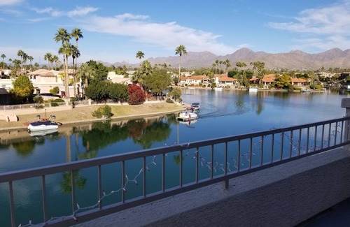 This is a 2 bedroom lakefront condominium. If you're looking for an excellent location while visiting BARRETT JACKSON AUTO AUCTION, WASTE MANAGEMENT TPC, SPRING TRAINING, or simply looking for a relaxing stay in the heart of Scottsdale, you've found the right place! This beautiful condo is located on Scottsdale Ranch. It is within a gated community with mostly year around residents. We are on the 3rd (top) floor, lakefront, with splendid views of the McDowell Mountains, Lake Serena, and Pinnacle Peak. Just across the street you will find The Mercado Shopping Plaza, which incudes a Planet Fitness, Goldie's Sports Restaurant and Bar, Circle K, Coffee and Donut shop, Eggstacy, Walgreens, Nail Salon, Dry Cleaner, Barbershop, Hair Salon, Chiropractor, and much more. We have two beautiful pools with hot tubs, Planet Fitness is just across the street, and we are also adjacent to the largest park on Scottsdale Ranch, which includes numerous sports courts of all kinds. The Senior Center is located directly adjacent to the park, and you can catch the extensive bike trails from here, which you can take all the way to Tempe should you wish to do so. Just a 3 minute drive from our condo, is the entertainment complex TALKING STICK, which features many entertainment options. Located there is Talking Stick golf course, Top Golf, Oddesy Aquarium, Butterfly World, Sky Diving facility, Arizona Diamondbacks and Colorado Rockies spring trainig ballpark, Tiger Woods newest venture, "Popstroke", and of course, a shopping area offering a variety of restuarants. On our lanai, experience lake life at its finest. Enjoy the waterfowl and birds, and in the pleasant evenings, the night sky is perfect for stargazing, on the lakefront lanai.
