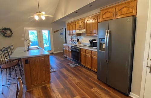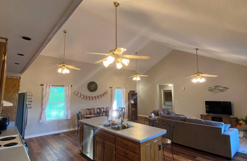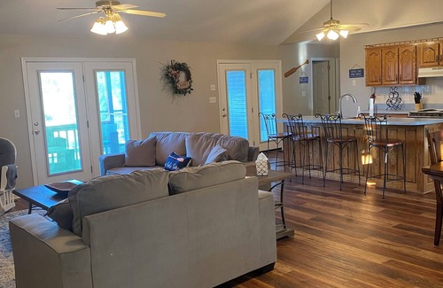 Enjoy warm inviting spaces with a country/fishing cabin feel. Plenty of perfect spots to sip a morning cup of coffee or a glass of wine while watching the birds on the lake. Bring the boat, launch it at the public boat ramp just around the corner, and enjoy world-class fishing and watersports before tying up at the private boat dock just steps from the back door. Relax around the firepit and watch the fireflies on the lawn, or bring your favorite yard games and take advantage of the huge backyard. On rainy days, snuggle in on the comfy couches to watch a movie or play a game. There's something for everyone here, rain or shine!