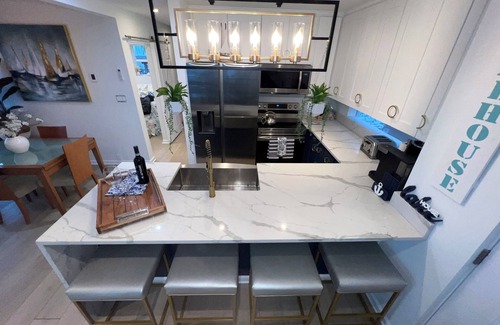 Fully equipped kitchen and dining room. Nice living room area with large leather sleeper sectional couch and huge new hi-definition TV.
