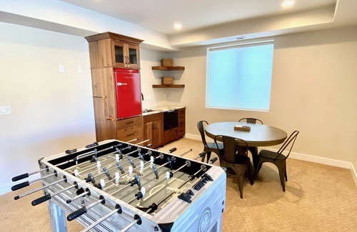 - Entertainment Options: The basement entertainment area includes a swim spa hot tub, sauna, foosball table, and a cozy family room, providing fun activities for guests during their downtime.