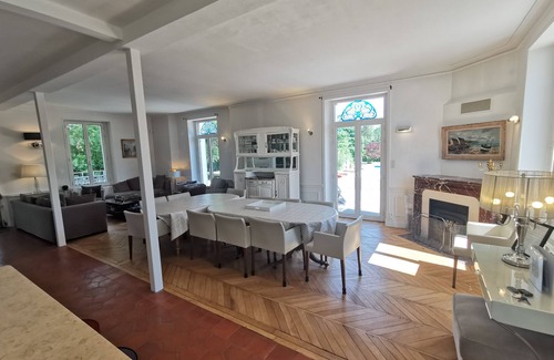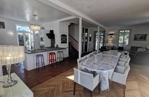 Large outdoor spaces, beautiful interior volumes, charm and light. Large south-facing terrace. With 6 bedrooms, very large, very bright living room on the ground floor. Heated swimming pool from May to September. Barbecue, ping-pong table. Not overlooked. Sauna. Outbuilding to house the bikes. Bakery, pharmacy, convenience store and tobacco shop 200m away.